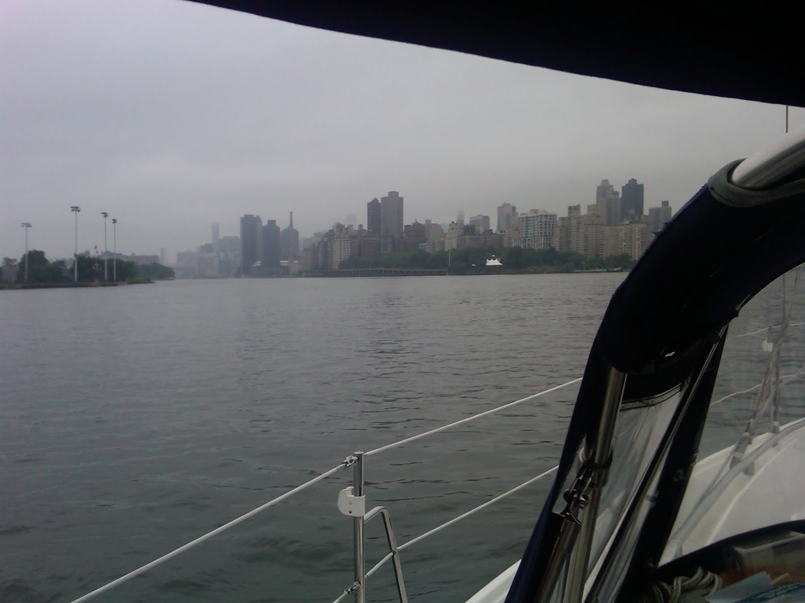 Friday was a well timed day. Nothing eventful, no storms. We were able to enjoy a nine hour trip with lots of sailing. We left Oyster Bay at 9am and were able to sail wing-on-wing until we stopped at City Island at 2pm for an hour for lunch. Wing-on-wing is the sail configuration of one sail to the port and the other to the starboard. This can only be performed when the wind is from directly behind the boat. Although the weather wasnt glorious, the sailing was. We had timed our trip so that we would arrive at Hell's gate at 5:30pm when there is slack water. We were sailing so well we had to stop and eat a little time. So we anchored on the western side of City Island for an hour for lunch - sandwiches and hobnobs. For those non Brits following us look out for hobnobs - they are chocolate covered digestive biscuits. If you see them in the store you must buy some.